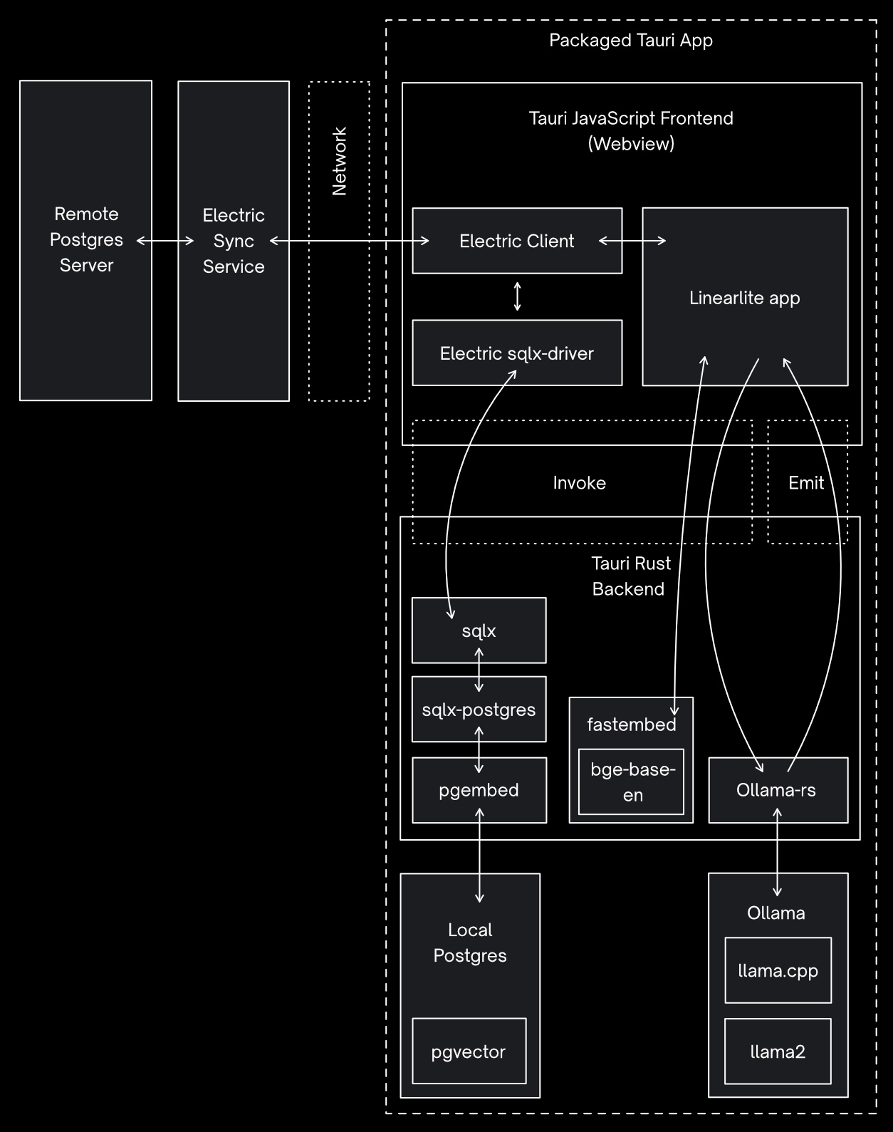 Tauri is an app packaging system for building desktop and mobile apps. It has a unique architecture where the front-end of your app is a standard WebView, using whichever browser is already installed on your system. And the backend of your local app is a Rust environment. Now Rust can import and run native code very well. So surely we could compile Postgres to run in the Rust environment. That would then allow us to run pgvector on device and use the bundled Postgres as the main local datastore.